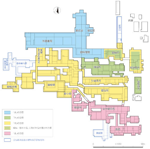 本丸御殿は、エリアによって受け持つ役割が異なります。大きく分類すると、公式行事等を行う応接空間である「表(おもて)」、藩の行政機構である「外(そと)」、藩主の執務や日常生活の空間であり藩主や側近が入る「内(うち)」、藩主にかかわる女性の居住空間である「奥(おく)」の4つに分けられます。