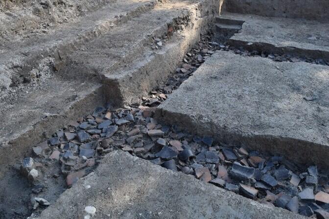 発掘調査の進捗に伴い、「御座間」南側では、新たに佐賀城本丸の造成に伴い埋め込まれた瓦の堆積層などを発見しました。また、「表御廊下」部分では、建物の柱を支えた礎石やその下部構造を発見しました。